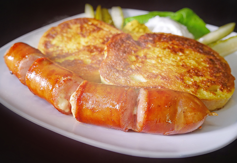 prženice,kobasica sa sirom,kis krastavac,senf,pavlaka,zelena