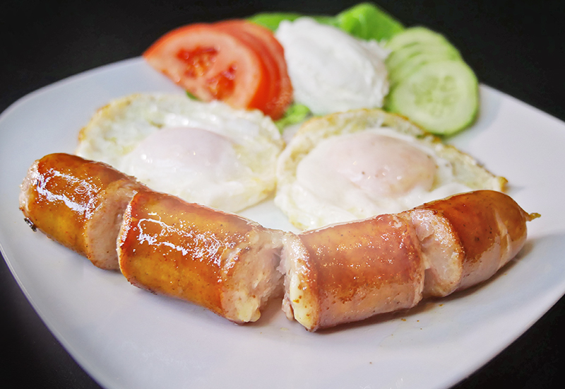 kobasica sa sirom,2 jaja,pavlaka,senf,salate,lepinja